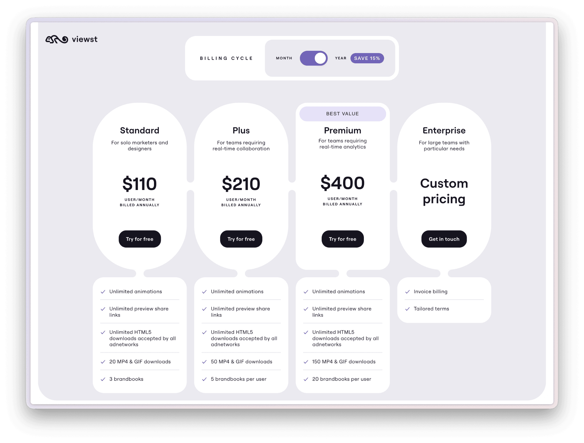 Viewst charges per seat with unlimited HTML5 and image exports on every plan. Standard starts at $110 per month, Plus at $210, and Premium at $400. Whether your team produces 50 creatives per month or 5,000, the cost stays the same. For high-volume display advertising teams, this unlimited model is meaningfully more cost-efficient at scale than credit-based pricing.