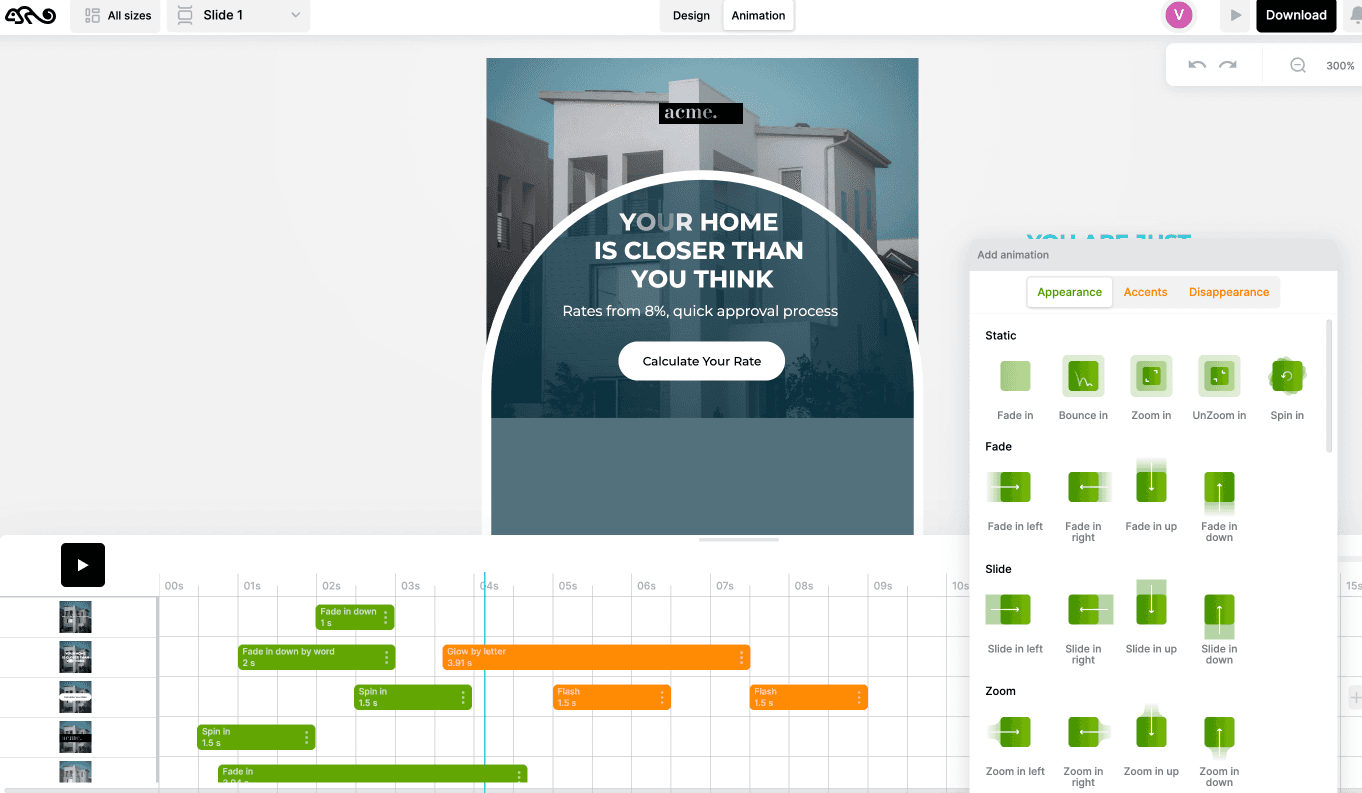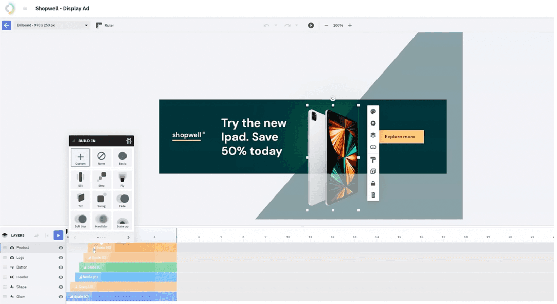 Creatopy provides its own animation timeline with a three-phase structure: build-in, middle, and build-out, each offering 36+ presets. A "Magic Animator" feature applies pre-built animation sequences with one click, and a custom animation builder supports move, rotate, scale, opacity, and blur properties.