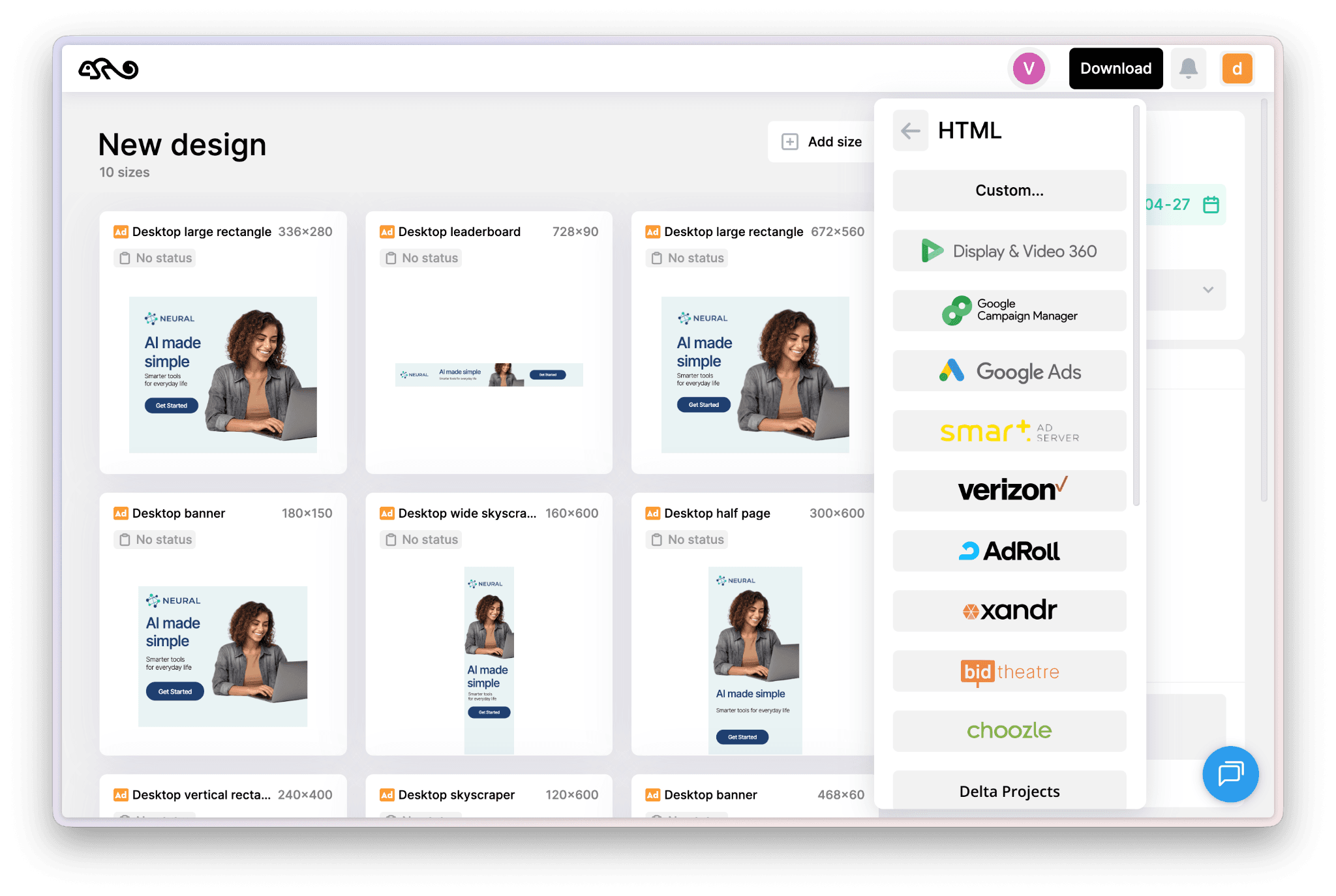 Viewst covers every standard ad format and lets you create custom dimensions as needed. Its unlimited resize feature is the centerpiece: design your master creative once, then auto-resize it to every required format in a single click. Text, images, and layout elements reflow intelligently, saving hours of manual adjustment. The output is native HTML5 — fully editable, lightweight, and accepted by every major ad network including Google Ads, Meta, and DV360.