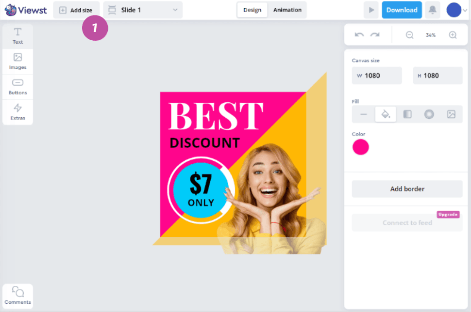 Text, images, and buttons will always be identical in different sizes within the project. You can create ads with additional content by duplicating and editing a creative.