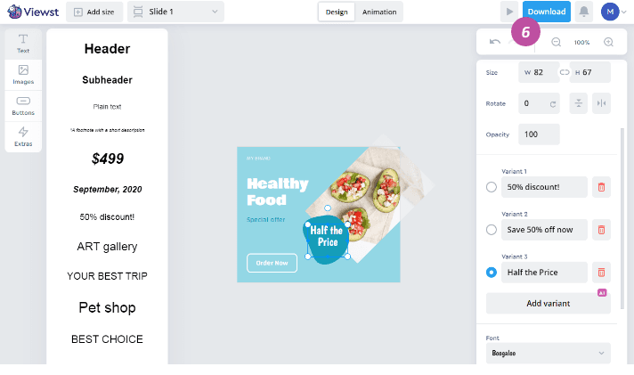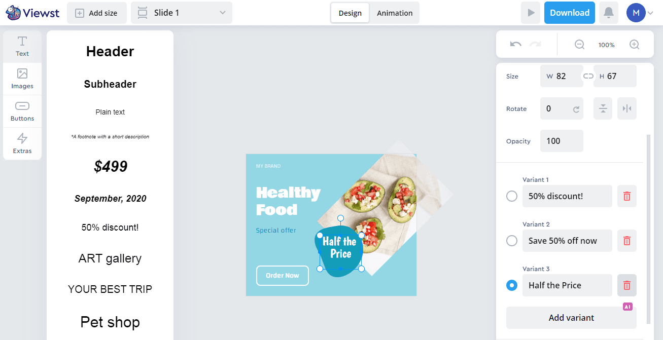 Viewst’s AI-powered creative copy generator works like magic and generates perfectly-fitted texts based on your creative content. With it, you can make creative variations for A/B testing in literally 2 clicks.