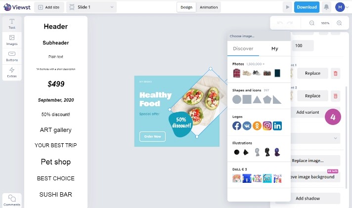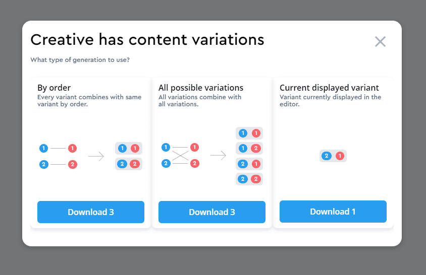 It means the ability to add multiple variants for each image, button (CTA) or copy, or even language on a ratio in a creative. This feature could be used for creating banners for e-com SKU’s, localization of a design to different languages, multiple A/B-tests, different CTA’s, and headings.