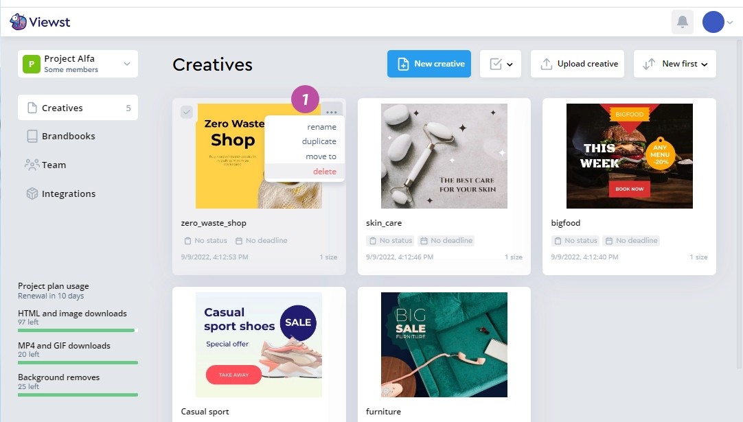 Open the creativeโs menu by clicking on the ยซโขโขโขยป button 1.