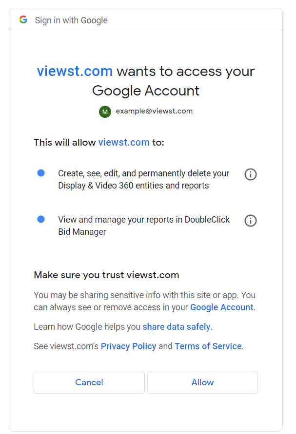 First, you need to log in to the Google account with DV360 access and accept the Viewst integration.
