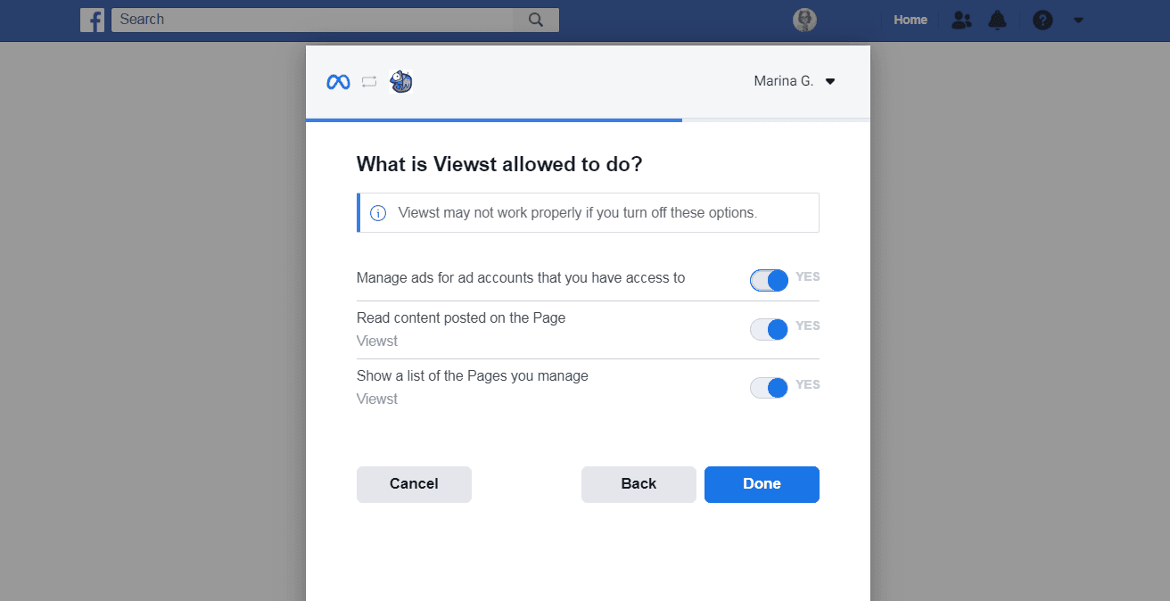💡 Please note that if you Log out of sessions of Facebook, integration with Viewst will also be interrupted. To restore integration, connect Viewst again with your Facebook account.