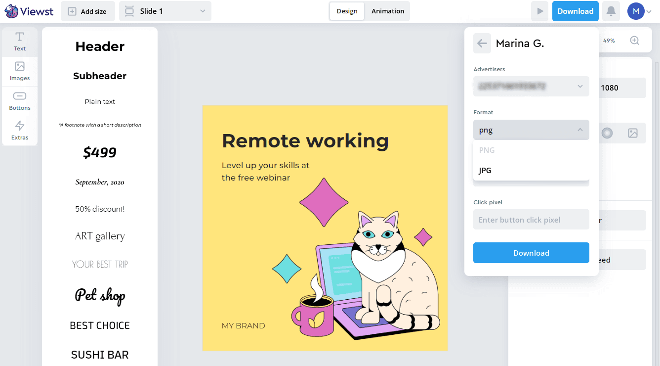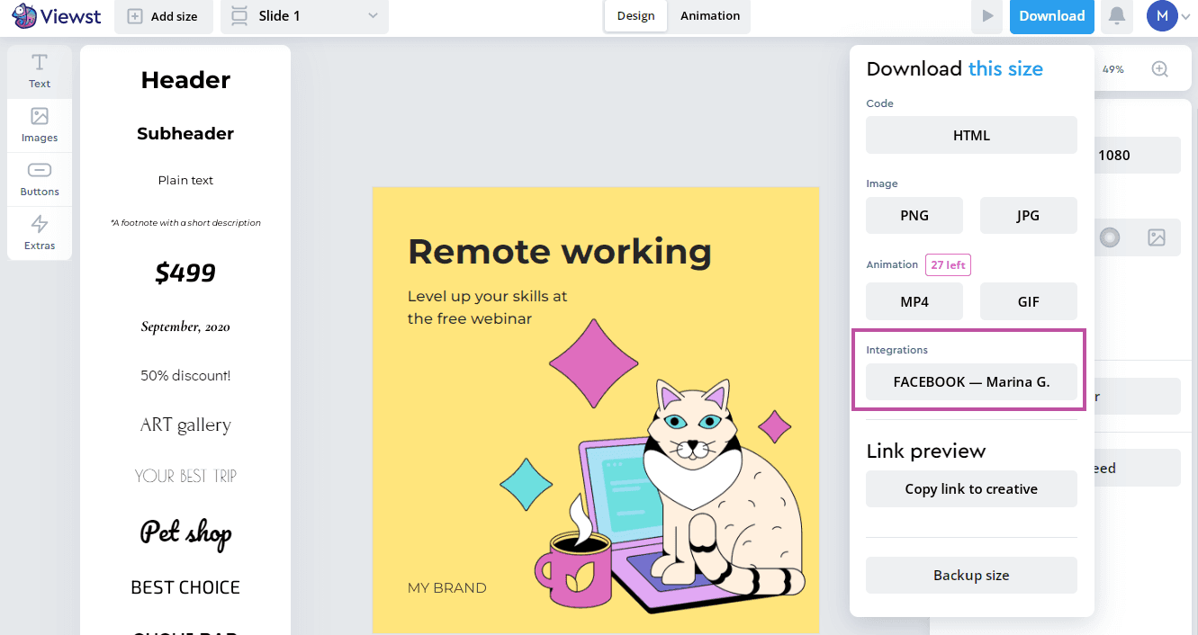 Now on the Download panel, in addition to the usual formats, you can streamline creatives to connected Facebook accounts.