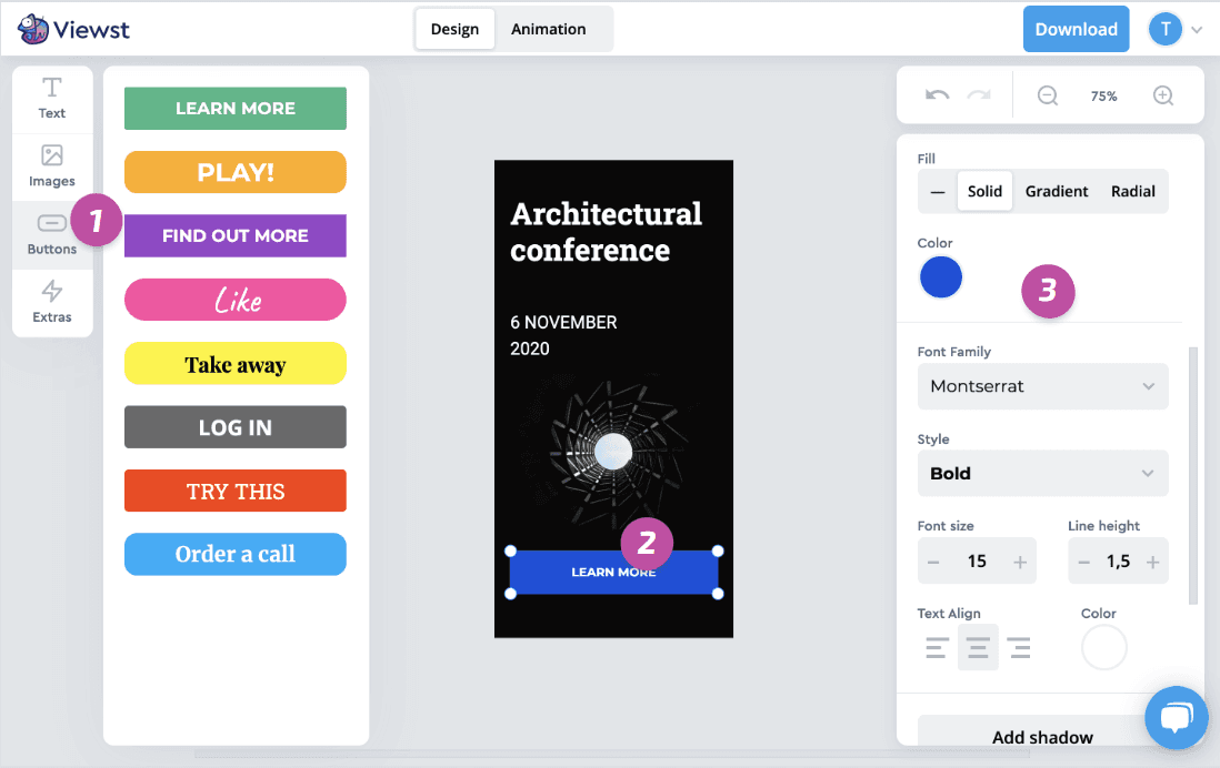 1Click on the chosen button element (choose one by style, you can edit the call-to-action text and color later) or drag and drop it onto the canvas.