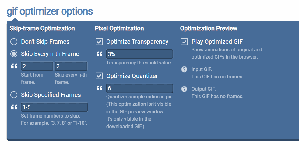 For example, in Online Gif Tools the skip-frame optimization changes the number of frames in a GIF. You can skip every 2nd, 3rd, 4th, or nth frame starting from any frame.
