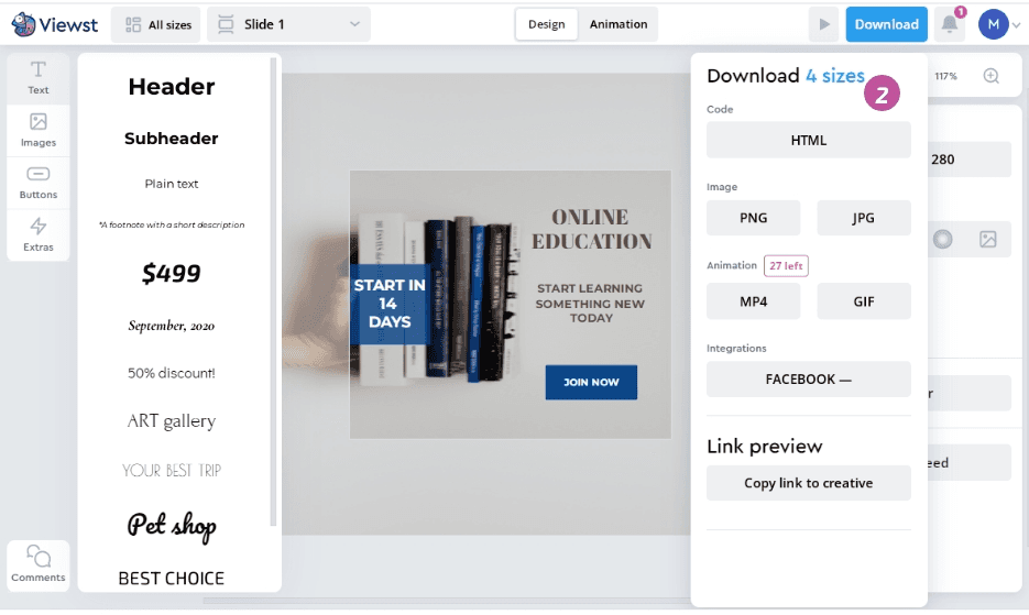 1option is selected. You can also switch it to All2and download all sizes of the creative.Click on the PNG or JPG button.