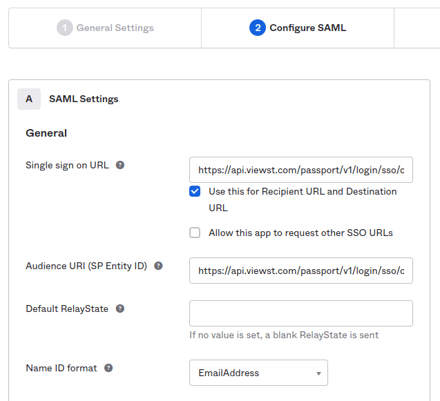 Copy Audience URI and SingOn URL ัะพ Okta SAML Configuration