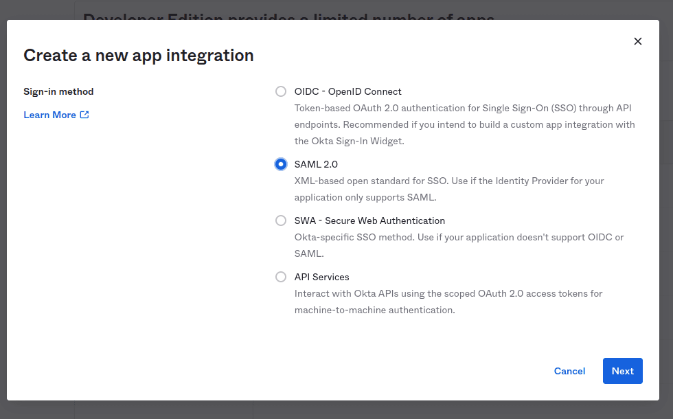 Select SAML 2.0 Sign-in method and click โNextโ button